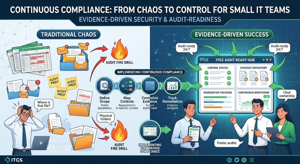 Small teams can absolutely meet high security and compliance expectations—if they treat evidence as part of daily operations, not an annual deliverable. ITGS helps you set up a workflow where audits become simpler, risk becomes clearer, and security execution becomes repeatable.
